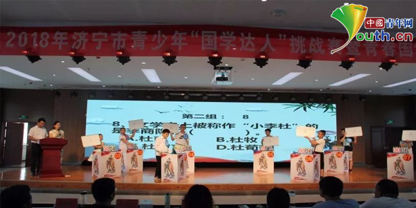 2018年济宁市青少年“国学达人”挑战赛暨青春国学荟活动分为高中组、初中组、小学组,各组设置初出茅庐、一站到底、问鼎达人三个环节。三轮比赛均为现场竞赛环节,采取客观题与主观题相结合的方式,经过激烈角逐,最终产生“国学达人”一等奖每组3人,二等奖每组6人,优秀组织奖6个。